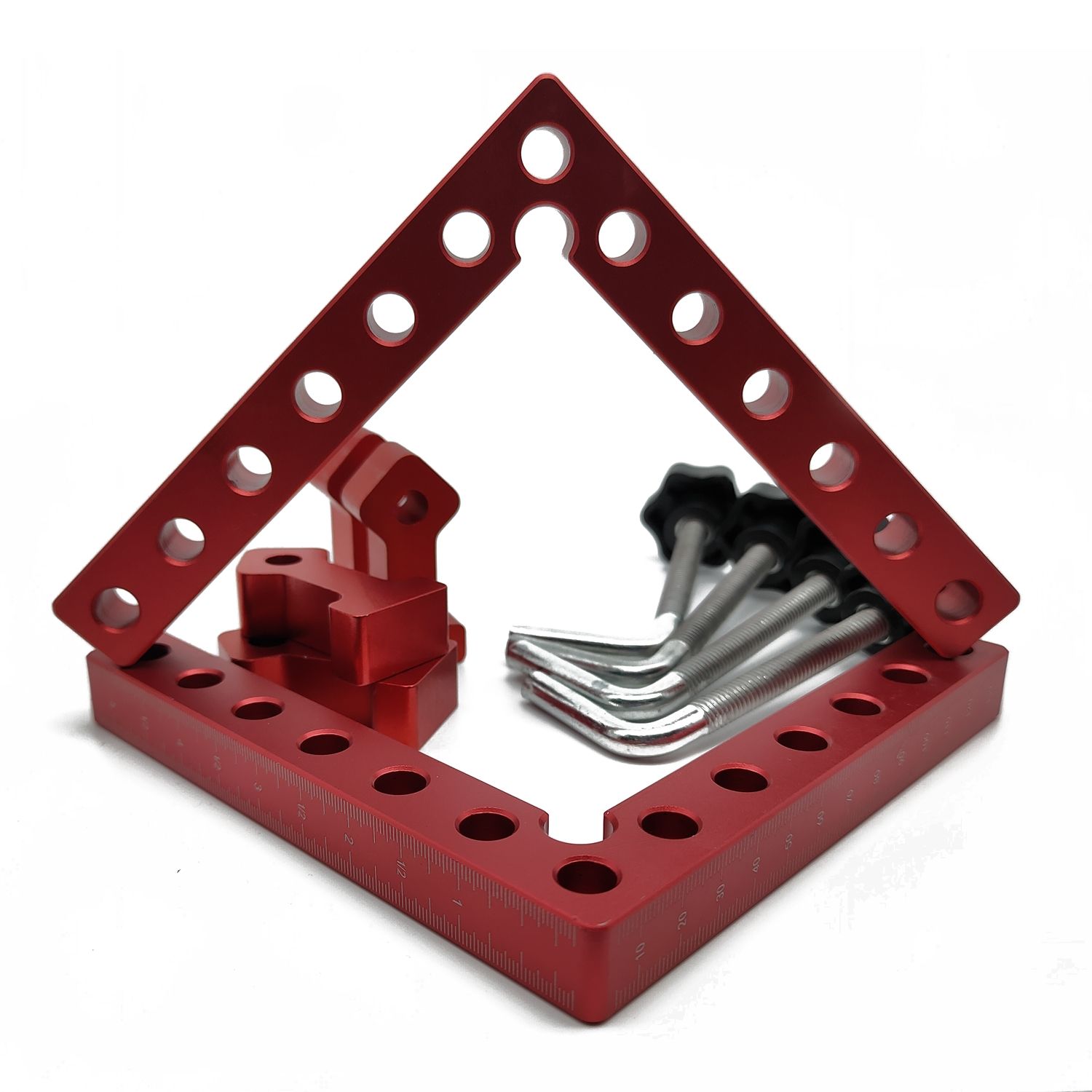 Имеет 2 шкалы измерений по двум сторонам угольника. Одна сторона с сантиметровой шкалой, вторая с дюймовой.