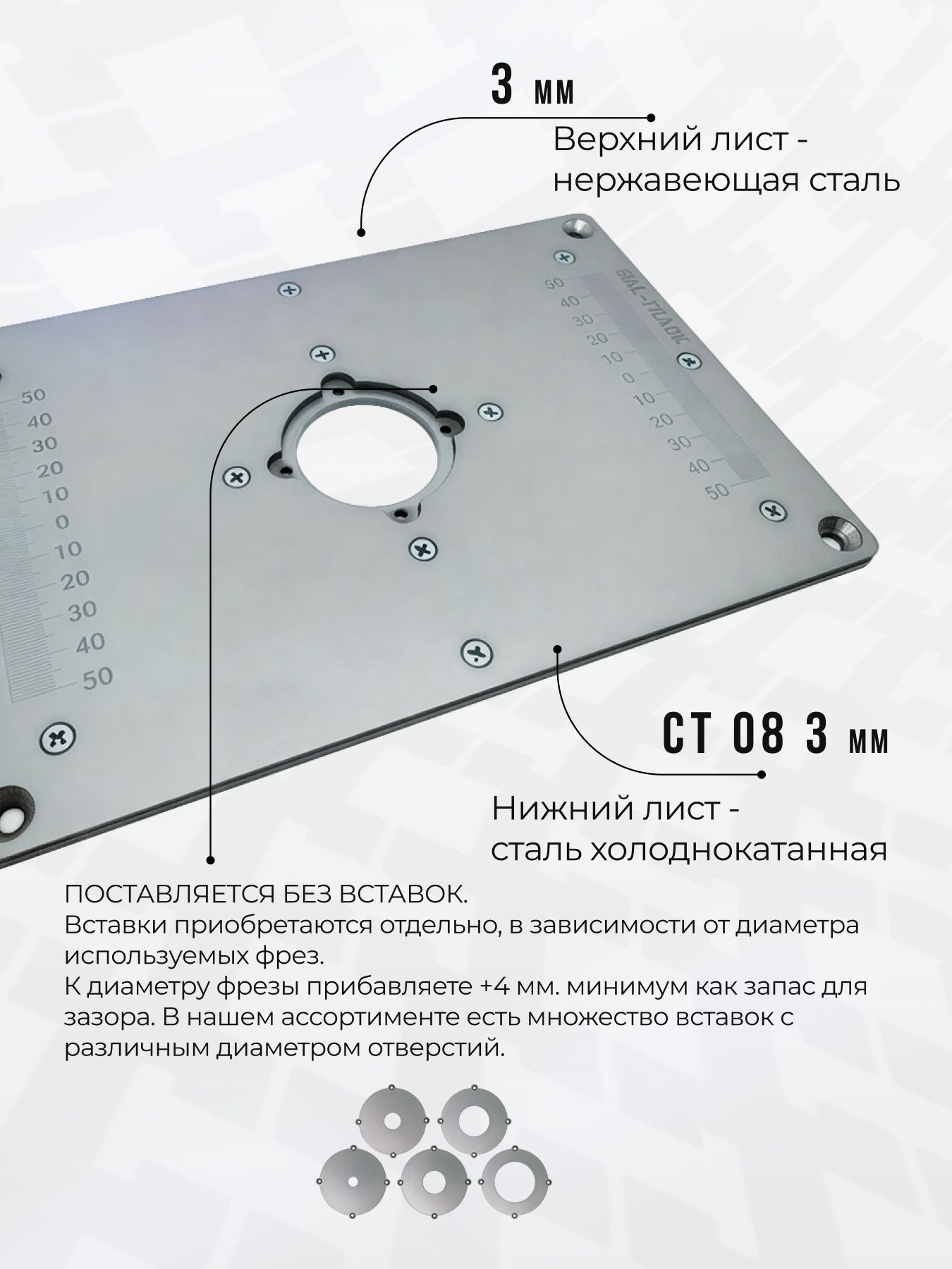 Пластина служит для крепления к ней ручного фрезера и установки конструкции в фрезерный стол.