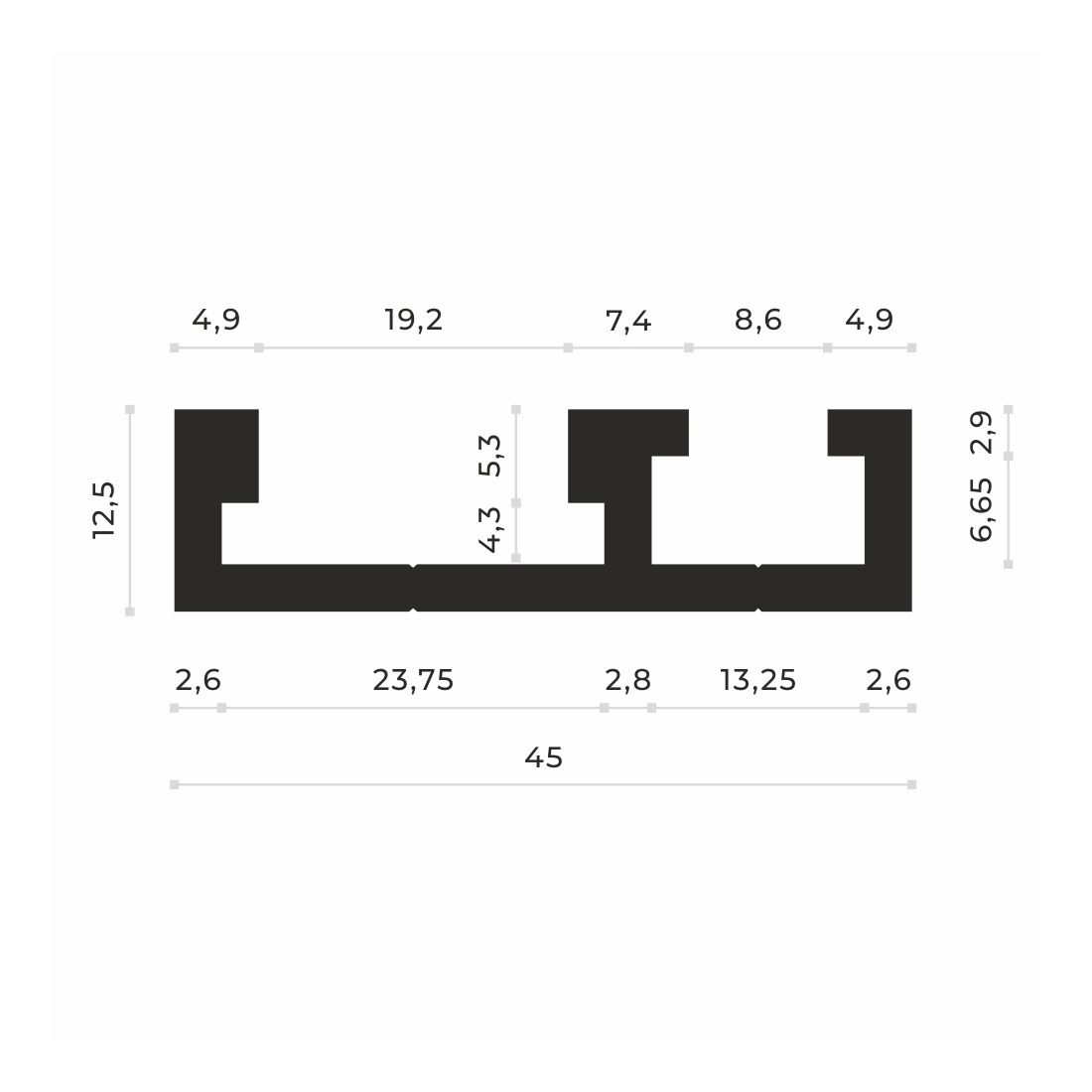 T-track профиль с двумя пазами 19.2 мм и 8.6 мм AL-T45 (1 м)