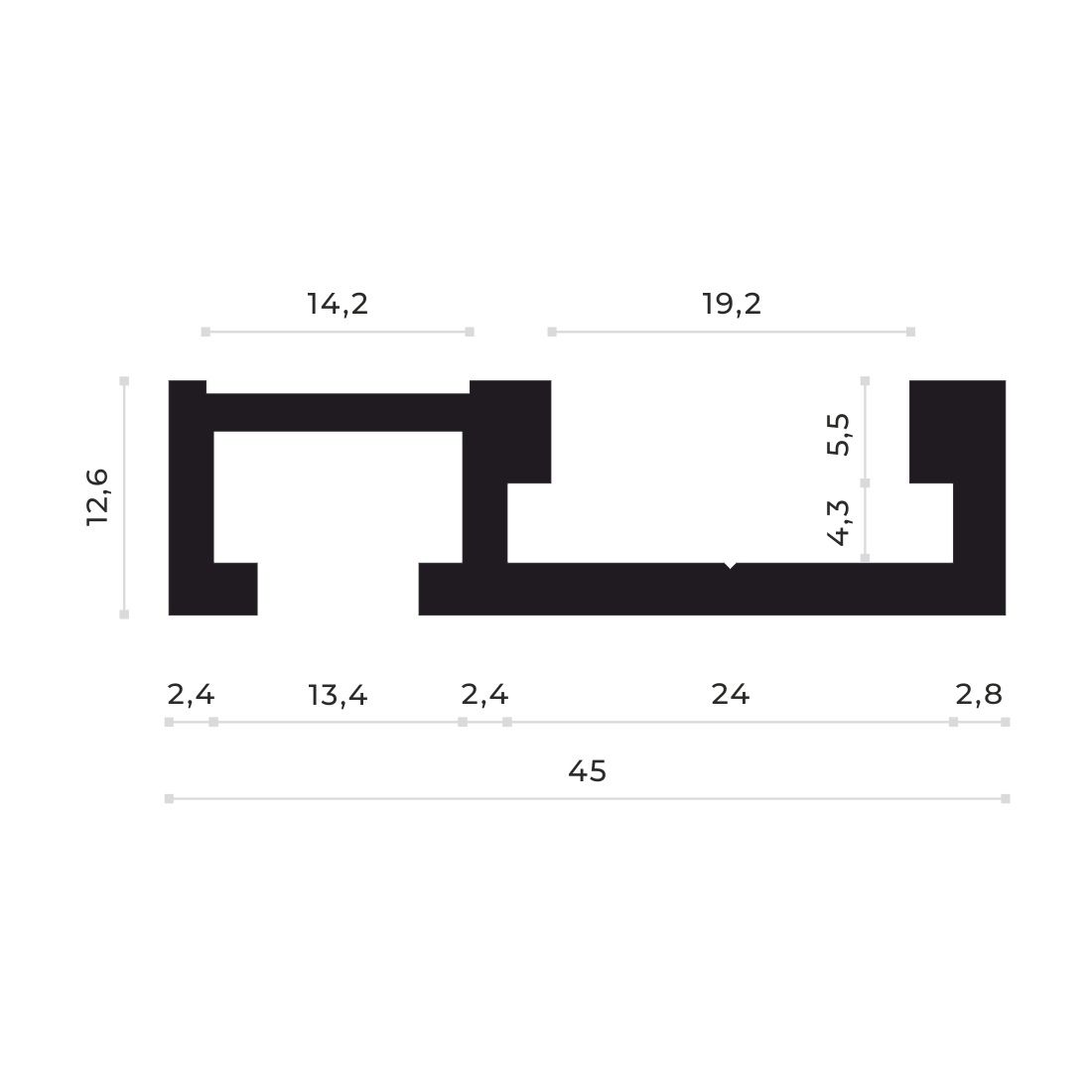 T-track профиль с пазом для линейки AL-T45L (2.5 м) от 0.1 до 3 метров