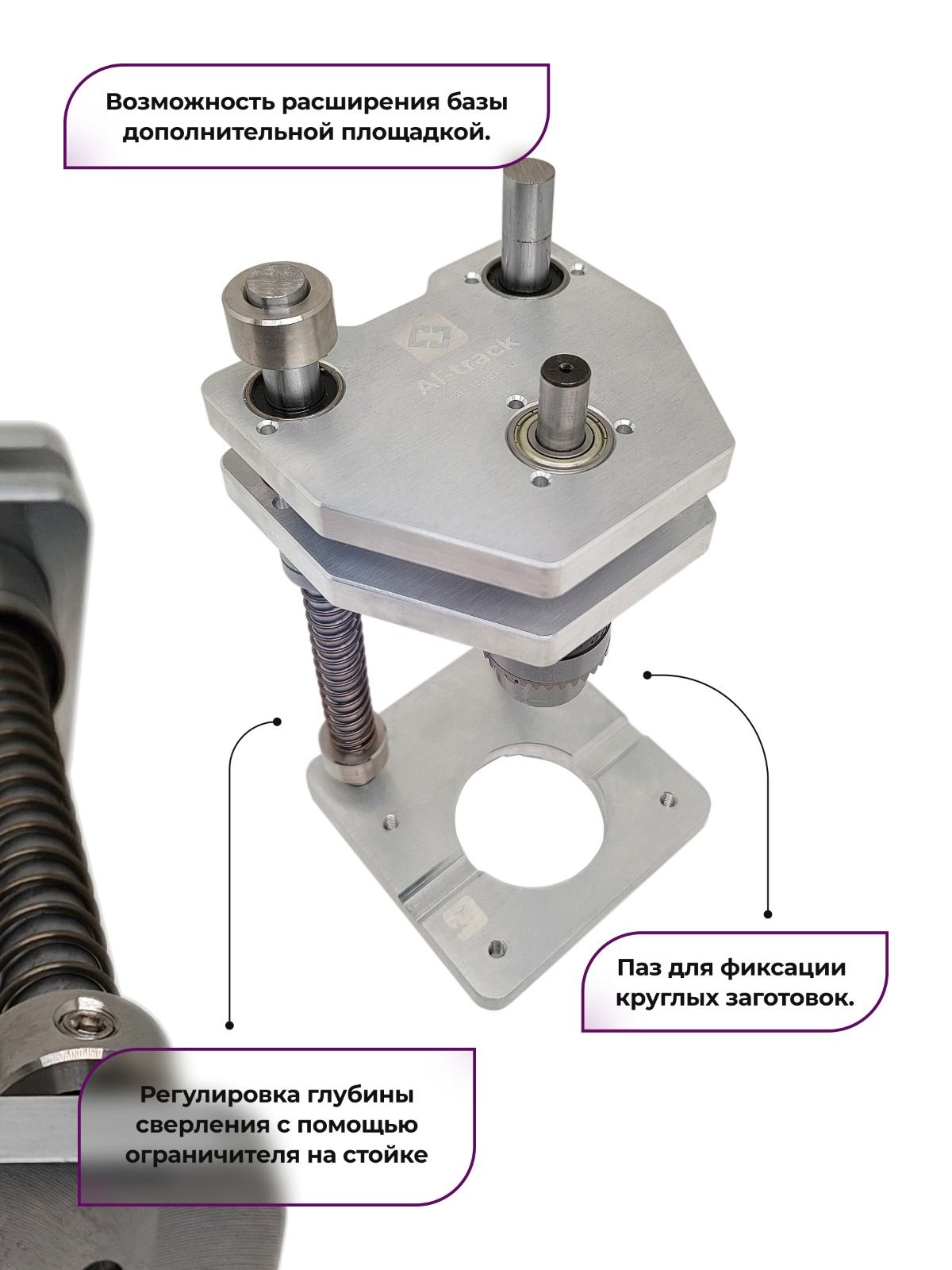 ⦁ Дополнительные возможности: Возможность регулировки глубины сверления с помощью ограничителя на стойке, возможность расширить базу стойки дополнительноц площадкой (для этого в стойке заранее предусмотрены отверстия с резьбой).