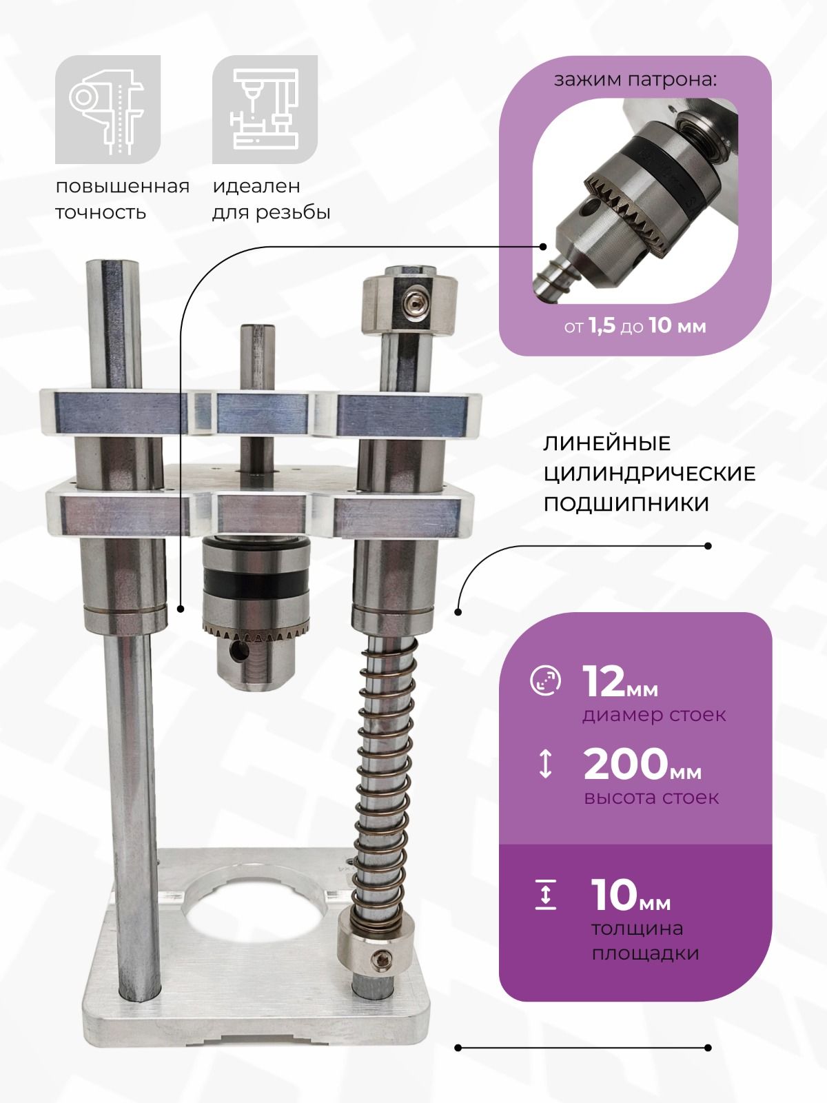⦁ Дополнительные возможности: Возможность регулировки глубины сверления с помощью ограничителя на стойке, возможность расширить базу стойки дополнительноц площадкой (для этого в стойке заранее предусмотрены отверстия с резьбой).Преимущества использования: