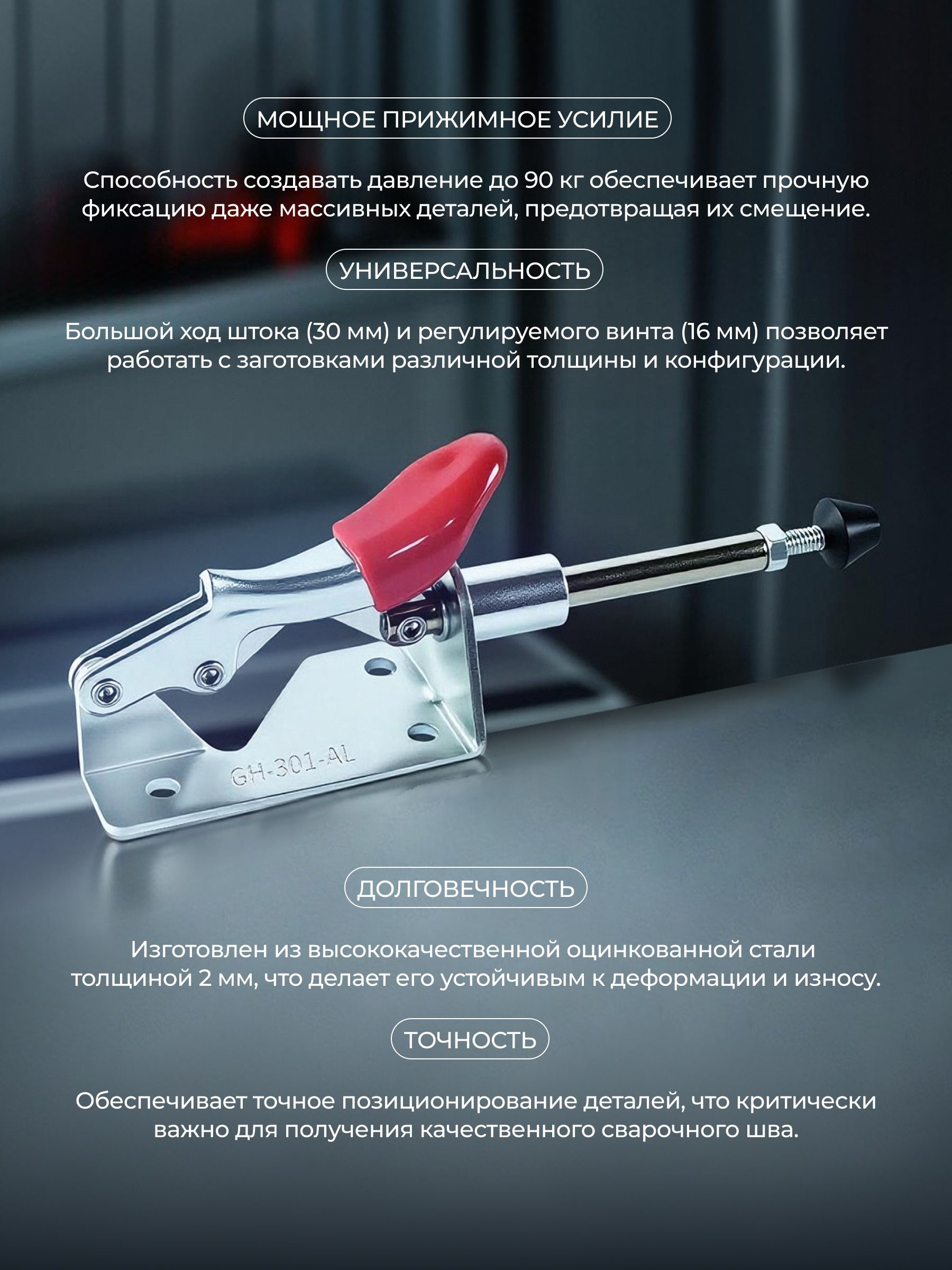 Мощное прижимное усилие: Способность создавать давление до 90 кг обеспечивает прочную фиксацию даже массивных деталей, предотвращая их смещение.