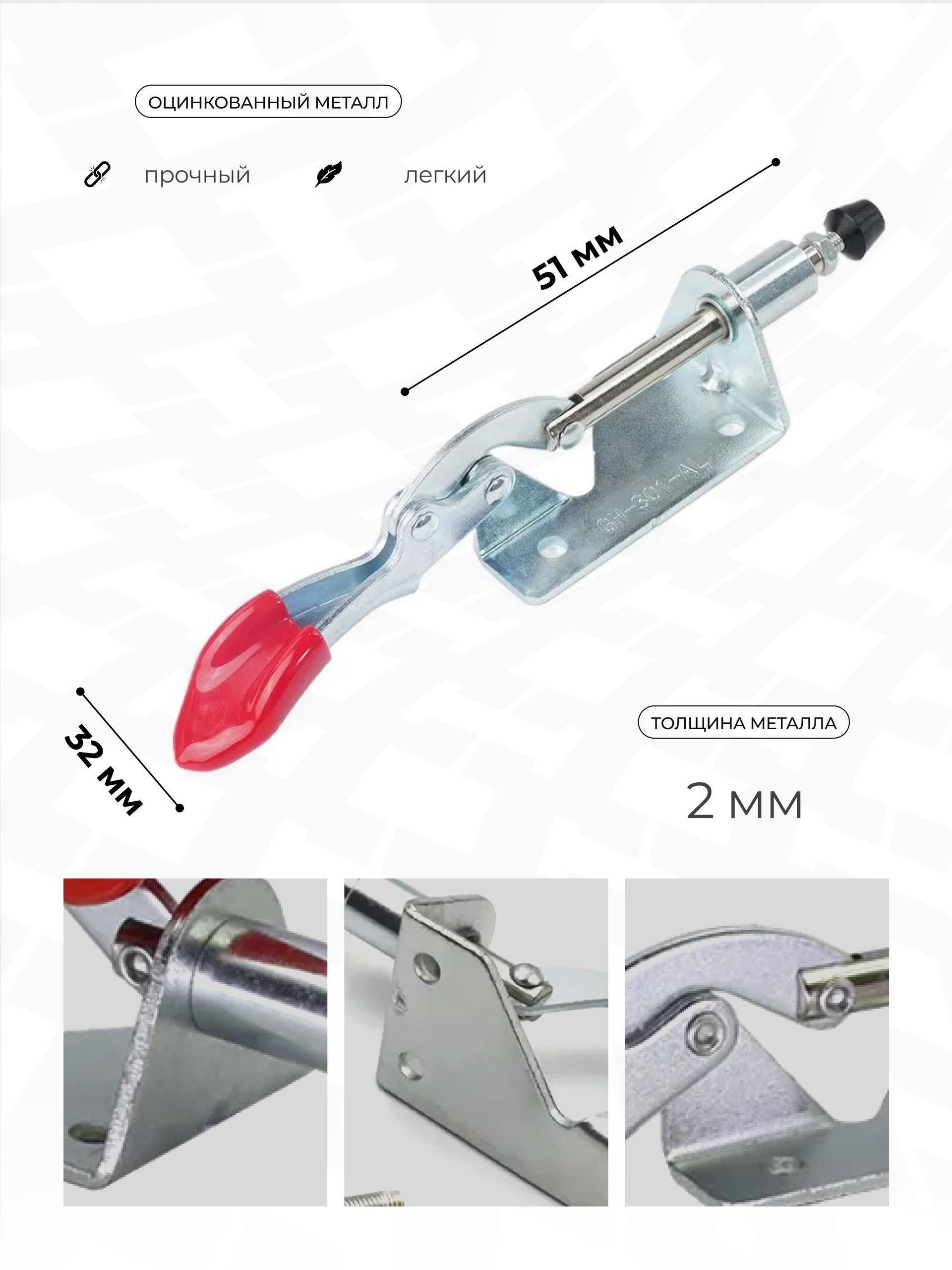 Механический зажим модели GH-301AL предназначен для надежной фиксации заготовок. Его прочная конструкция из оцинкованной стали гарантирует устойчивость к механическим нагрузкам и коррозии.